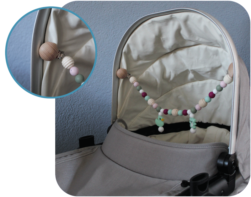 Wanneer je lekker gaat wandelen met je baby, dan is het leuk als je kleintje iets te kijken heeft. Een wagenhanger of wagenspanner is daarom gemaakt van mooie kleurtjes en verschillende vormen kralen.